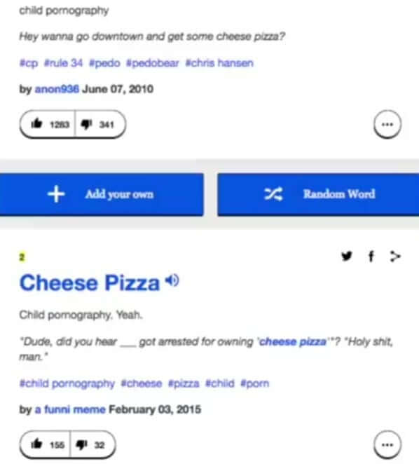 Cheese pizza means child pornographic material or minor girls in general.