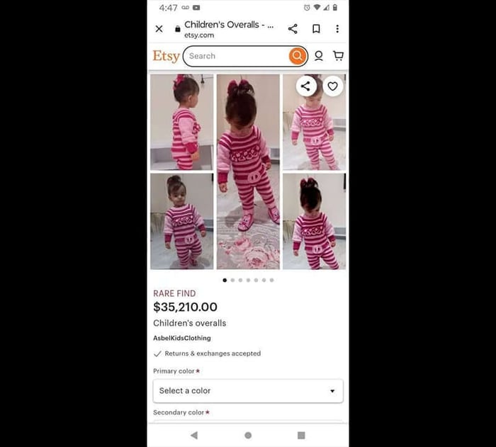 But the most shocking discovery on Etsy was yet to come. It was this ad, simply titled “children’s overalls.” It was priced over 35 thousand dollars and had over 30 photos of the same toddler wearing pajamas.