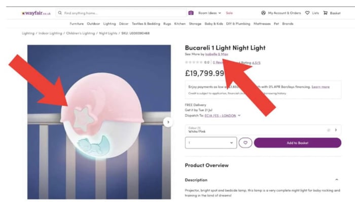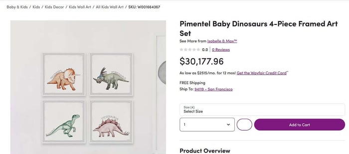 After this discovery, people began really going over the listings with a fine-tooth comb. A guy on Reddit noticed that a seller called Isabelle & Max had some basic dinosaur wall art (something you would buy at Hobby Lobby for $30 or less) listed for $30,177. (http://wayfair.com/baby-kids/pdp/isabelle-max-pimentel-baby-dinosaurs-4-piece-framed-art-set-w001664367.html)