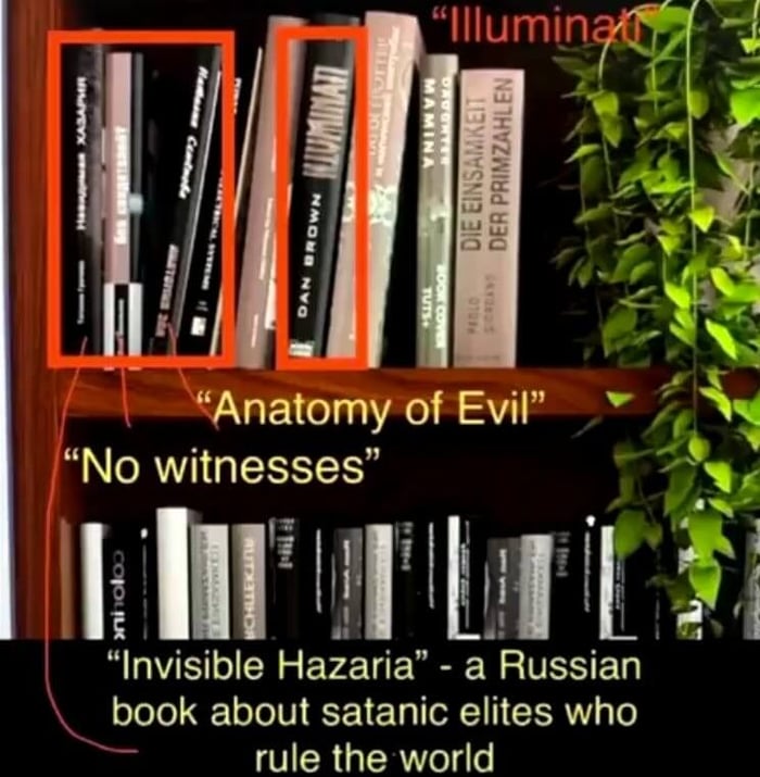 The titles on this shelf include Illuminati, Anatomy of Evil, No Witnesses, and a book about satanic elites who rule the world. A lot of the books are Russian.