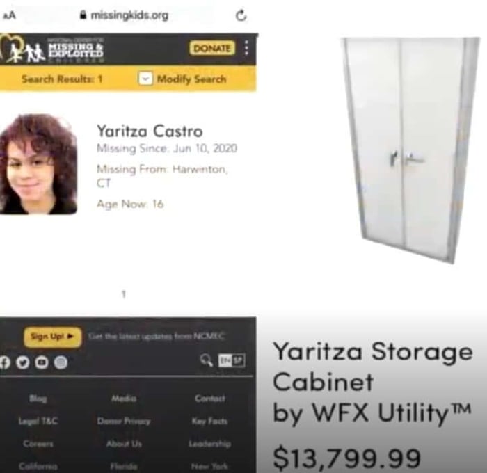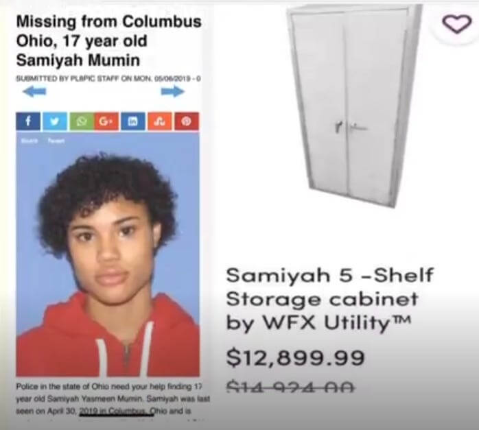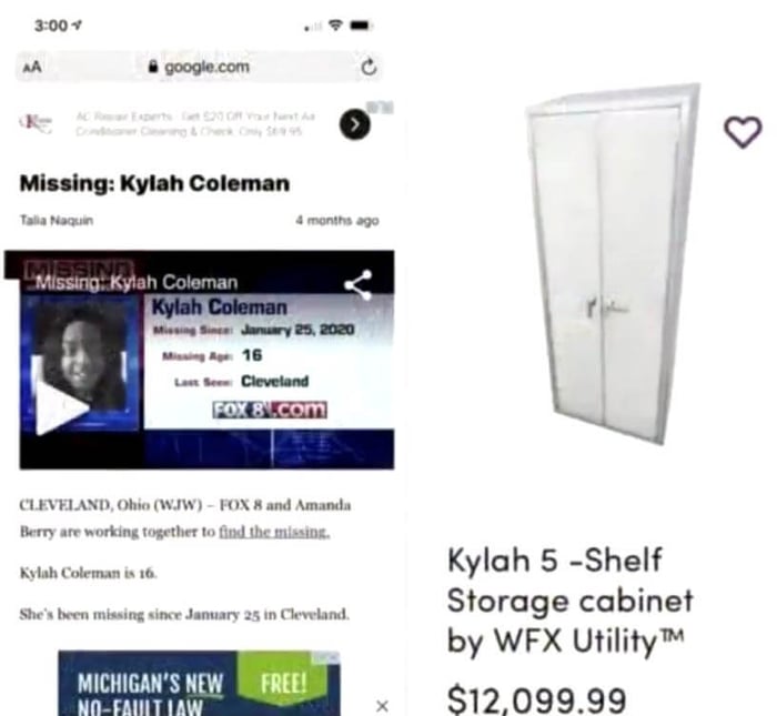 People began noticing that the names of the items on the sites (Wayfair, Amazon, Etsy) matched missing children reports. For example, this utility cabinet, which was priced at nearly thirteen thousand dollars, was called the Samiyah. Meanwhile, there was a 17-year-old missing child from Columbus, Ohio, named Samiyah.