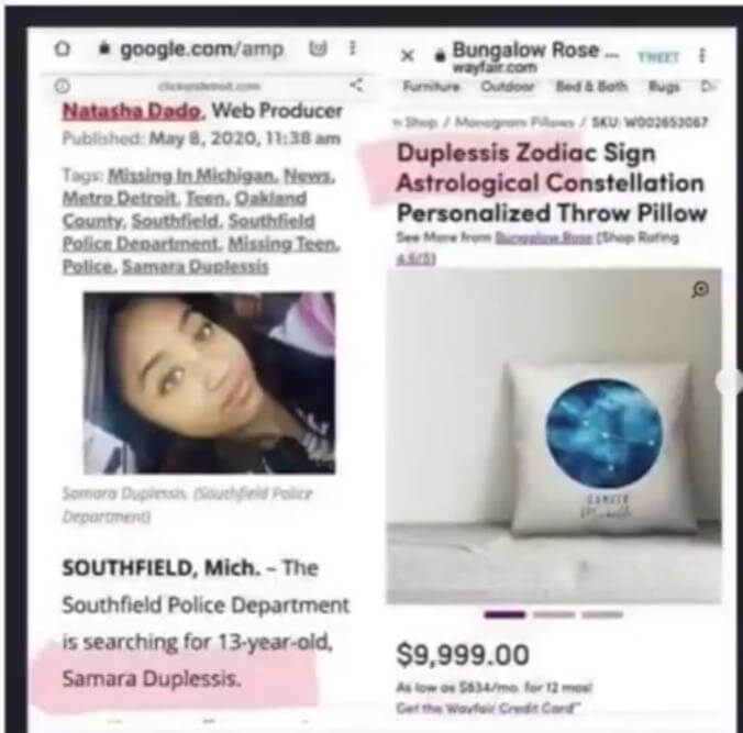 Here’s a 13-year-old female named Duplessis. She went missing in Michigan. On Wayfair, there was a throw pillow named the Duplessis, which was priced at almost ten thousand dollars.