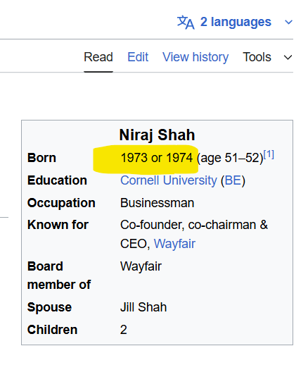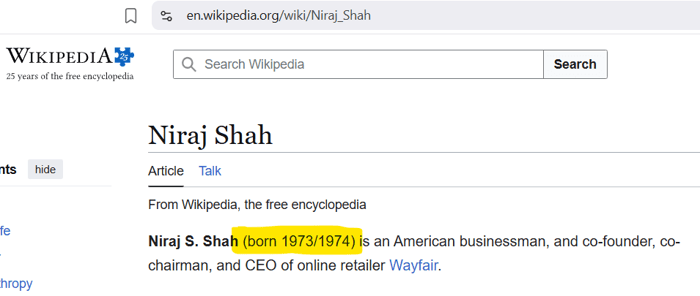 The CEO of Wayfair is Niraj S. Shah. Strangely, his Wikipedia page doesn’t know how old he is.