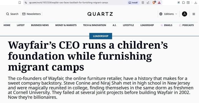 Just as Mr. Koons is passionate about missing children, Wayfair is too. The CEO, Niraj Shah, is the founder of the Shah Foundation. What does this entity do? According to its site, it deploys “funding and expertise in partnership with government to build innovative models at the intersection of education, healthcare, and community.” Specifically, it is very involved with schools. Meanwhile, it is involved with migrant camps.