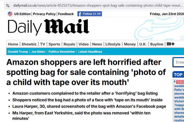 Keep in mind, when a child is stolen, it is imperative to get them out of the area and even out of the country as quickly as possible. Coastlines are key here. Now think back to the art world’s galleries, auction houses, a 91 million dollar rabbit, FTZs, cargo ships with special, secretive shipping channels that bypass traditional customs, and the government employees who are obligated to conceal whatever is in the ambassador’s shipment, then all of this is blanketed with diplomatic immunity… yet no one can seem to put 2 and 2 together… either ignorance is bliss or this is one of the biggest cover-ups of our lifetimes. And when you hear all of that, it makes this news headline extra creepy. The headline was, ‘Amazon shoppers are left horrified after spotting bag for sale containing ‘photo of a child with tape over its mouth.’