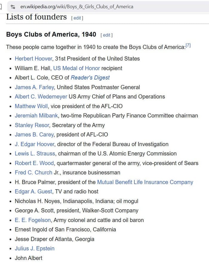 Shah’s charity is heavily intertwined with the Boys and Girls Club of America. If we visit the Boys and Girls Club of America Wikipedia page, we discover it was founded in 1940 by a whole bunch of men. Lots of US government and Army men, the US Postmaster General, as well as an oil tycoon, the CEO of Reader’s Digest, and even gay pedophile FBI director J. Edgar Hoover. They all just wanna help little tykes.