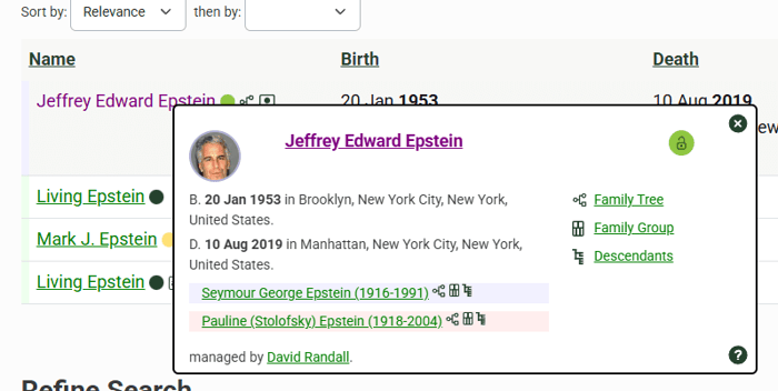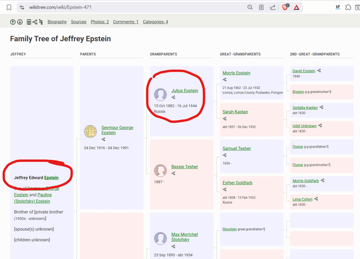 Then there’s another name on that list of founders: a man named Julius J. Epstein. If we go to Mr. Julius Epstein’s family tree, who do we find? None other than Jeffrey Edward Epstein.