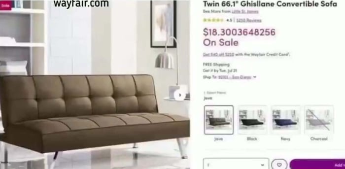 The entire situation became even more surreal when researchers discovered a very oddly priced couch on Wayfair.com that happened to be named the Ghisllane Convertible Sofa. This specific piece of furniture was priced at $18 and 3003648256 cents.