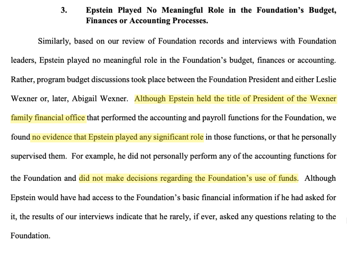 She got herself arrested at the Eric Garner protest. The demonstration involved blocking traffic in New York City “to draw attention to police brutality and racial injustice,” because if there’s one way to bring attention to bad cops, it’s by making it so people can’t make it to work on time. Wex’s Jewish leadership program, along with the Wexner family’s philanthropic foundation and the Wexner Israel Fellowship, was run by Jeffrey Epstein. Jeff's official title was president of the Wexner family financial office, but law enforcement detectives insist he didn’t play a “meaningful role” in the businesses.