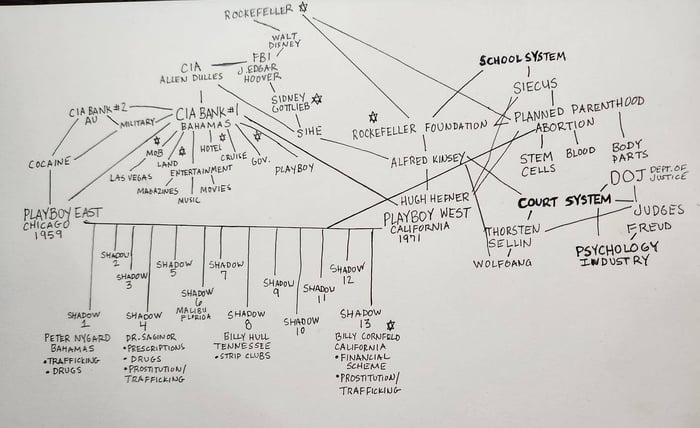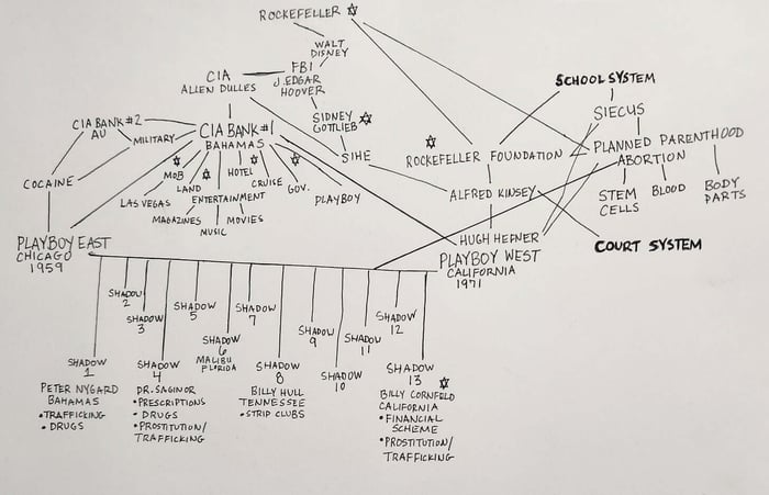 You may think this is the most ridiculous nonsense you have ever heard; obviously little children don’t want to be touched by old men, no, all men are not sexually molesting kids, and clearly women don’t want sex forced upon them when they are uninterested, but the US government didn’t think so. Kinsey was brought in to testify for the California Legislature. At this time he recommended lessening the penalty for sex crimes, reducing sentences for offenders, and even parole for violent sex offenders - after all, the kids love it and everyone’s doin’ it. - I’ve never done this before, but I think it makes sense. I am going to add on to a flowchart, specifically, the flowchart from my Playboy-CIA series. Let’s make the connection between Alfred Kinsey and the court system: