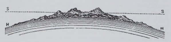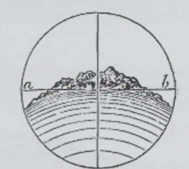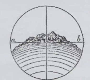 However, when looking through the theodolite, the crosshairs showed the land and water perfectly horizontal.