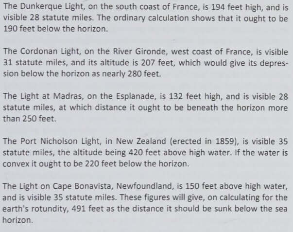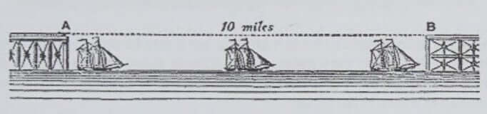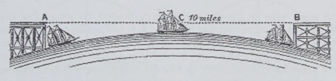 In another experiment, he stationed a ship exactly in the center of 10 miles between two points. Due to 66 feet of curvature, the ship should be elevated above structures on both sides....