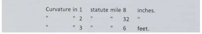 So, based on the size of the earth, the curvature in one statute mile is eight inches - this is a well-established “fact,” this is not something Mr. Roebotham decided upon. Three statute miles are six feet (1.8288 meters) of curve, 20 statute miles are 266 feet (81.0768 m) of curve, and so on. (If you’re wondering what exactly a “statute” mile is, it's a unit of linear measurement equal to 5,280 feet or 1,609.344 meters). Here is the curve-per-mile chart shown in the book: