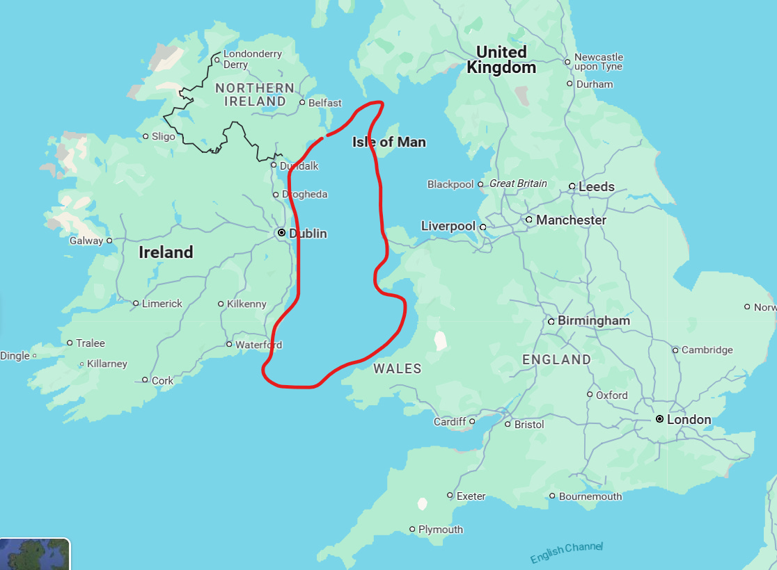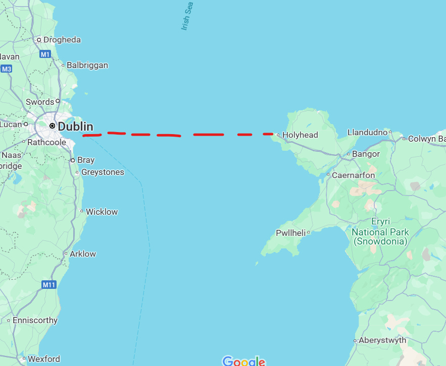 From the center of St. George's Channel (near Dublin) to Holyhead is at least 60 statute miles across.