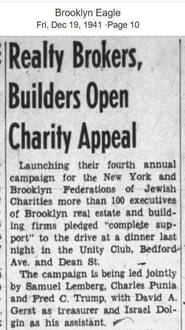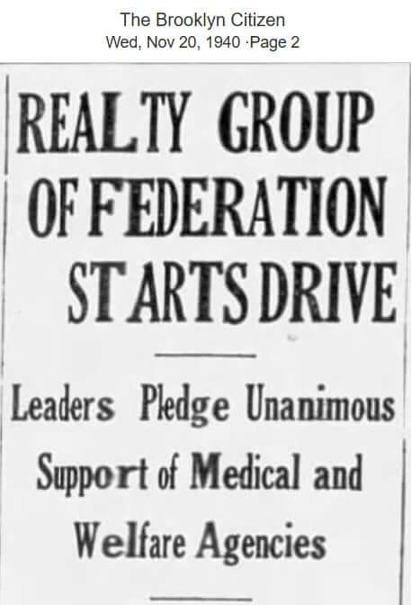 In 1940, Fred, along with Jewish Paul Warburg (founder of the scam Federal Reserve), Jewish Edward A Hearn (president of the East New York Savings Bank), Jewish Judge Edward Lazansky, Jewish Fred Kronish (coal tycoon), and Jewish New York Supreme Court Justice Jacob H Livingston, pledged support for the Federation of Jewish Charities.