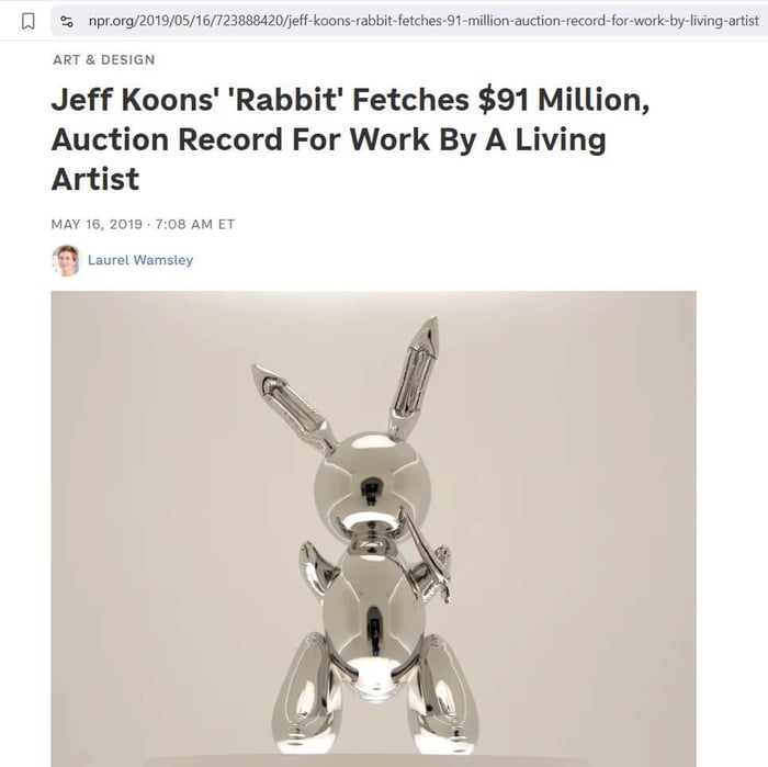 In 2019, Koons sold a piece of art that broke a world record for the most expensive art sale in history by a living artist. The art is a silver-colored rabbit that is supposed to look like a balloon animal. It was not made of precious metal; it’s made of stainless steel, yet it sold for 91 million dollars.