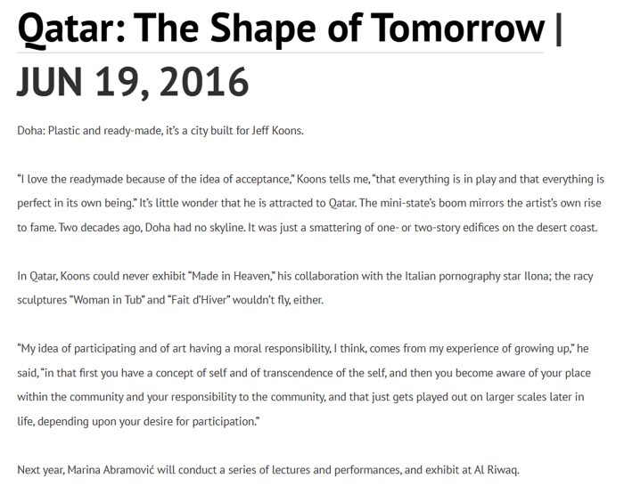 Despite the pedophilia accusations and affiliation with one of the most powerful members of Skull and Bones, Koons is also a frequent guest of the Qatari royal family and even helped them develop, of all things, a museum. Of course, Koons can’t put his filth in their nation because they are not “tolerant” of such immorality…