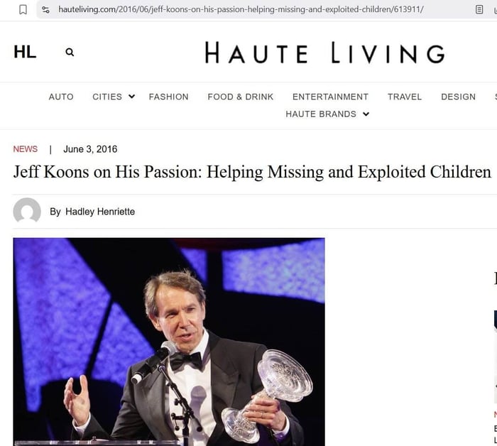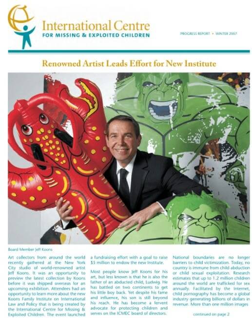 “[Koons is] a family man, who gives time and money to the International Centre for Missing & Exploited Children (ICMEC) and has even started the research arm of the organization, The Koons Family Institute on International Law & Policy. The organization advocates, trains and collaborates with global partners to protect children from abduction, sexual abuse and exploitation.”
