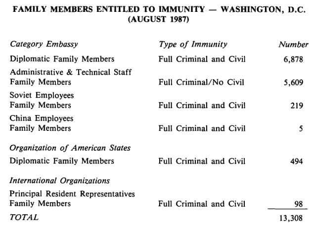 Based on the 1987 US Census, there were 638,333 residents in DC. That means over 2% of the residents of the city are not bound by the laws of society! In a room of 100 people, two to three of them have immunity from the laws of the city and country in which they are residing. And this is just family members! Insane!