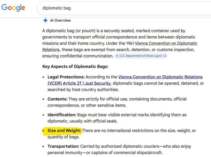 This convention is also where the diplomatic bag (aka diplomatic pouch) was invented - the super special bag that nobody can touch, look in, or even X-ray. The entire concept is so ludicrous that it’s almost humorous.