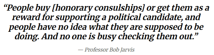 “The worry among those who have long questioned the honorary consul system is that countries anywhere in the world can put a diplomatic shield around private individuals thousands of miles away simply by naming them consuls.”