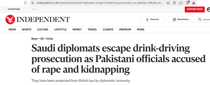 Then there were the two Saudi diplomats who were suspected of committing 14 crimes, including drunk driving, rape, and child abduction, who were protected from British law by diplomatic immunity.