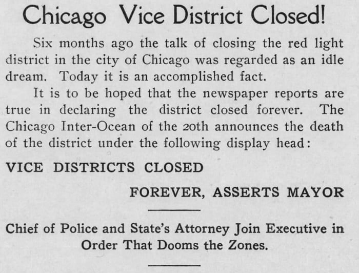 And, as you could have guessed, our lovely politicians of the time were getting their kickbacks for allowing this illegal shit to prosper. One of the areas involved in this disgusting filth was the Chicago Vice District, which, at the time, was controlled by a group of violent Italian thugs who called themselves the Chicago Outfit. These guys were allowed to run amok by the dishonest politicians who enjoyed their cut of the slavery-trafficking network. But it reached a point where the politicians got in too deep and the public demanded their removal from office. In 1912, the Chicago trafficking district closed.