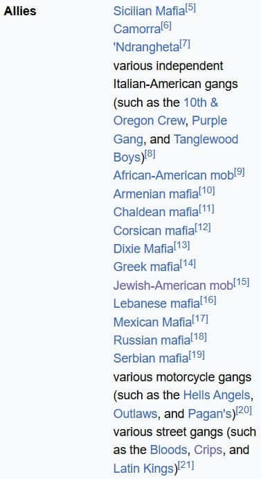 As of this point in time, the mafia had gained control over everything from trucking companies to shipping ports, clothing manufacturers, the kosher industry, and more, right down to picking sports winners. Meanwhile, they had struck partnerships with dozens of mobs outside of the five families in addition to entities like the Hells Angels and the Outlaws biker gangs, the Bloods, Crips, Latin Kings, and other “street gangs,” the Russian Mafia—everyone you have been led to believe is an independent entity working on behalf of itself is not—and keep in mind, this list is just who researchers have uncovered.