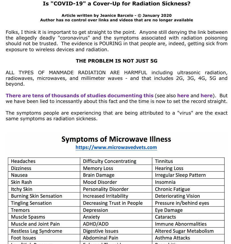 A bingeable, read in one sitting, 23-page, well-sourced eBook that outlines the startling similarities between what is being called "Covid" versus what is known as "radiation sickness" - and as the author, Jeanice Barcelo, points out, people falsely believe only 5G towers are to blame. CHECK OUT THE TRAILER FOR THIS AWESOME eBOOK: